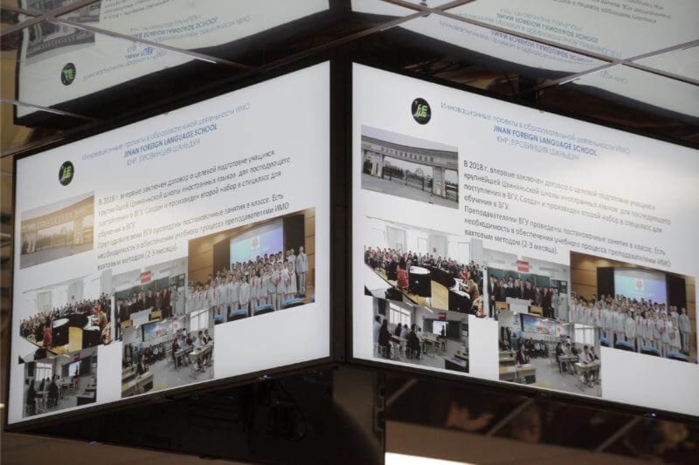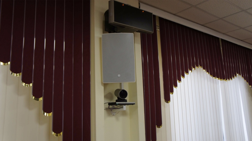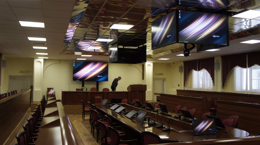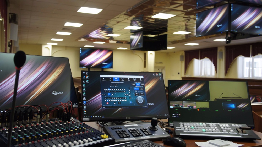 В актовом зале установлены две видеостены. Над сценой — видеопроектор с короткофокусным объективом. Три PTZ-камеры обеспечивают демонстрацию изображения мероприятия на видеостены, экран зала и трансляцию.
