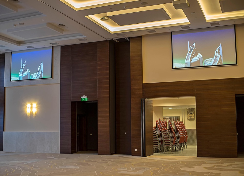 главный балл-рум площадью 600 м2 может трансформироваться в фомате 1 :1/3 :2/3 и оснащен двумя проекционными системами с выдвижными экранами 3х2 м и большой сценической проекционной системой с размером изображения 7х5 м и мощностью светового потока 25000 ANSI Lm