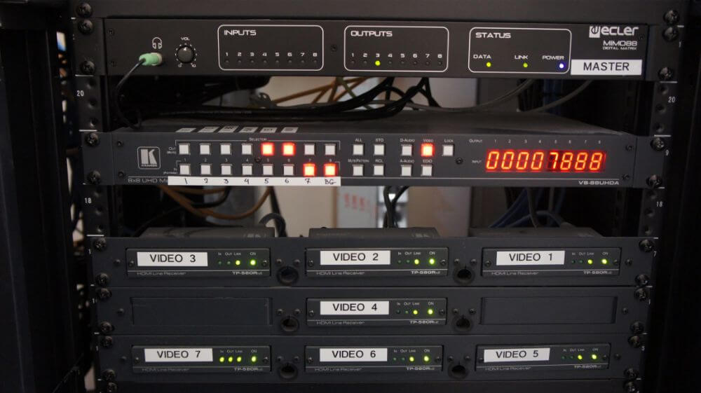 Мультимедийные возможности отеля реализованы на современнейшей централизованной цифровой AV-системе на базе 4К оборудования KRAMER. Все входящие и исходящие сигналы в цифровом виде коммутируются в центре управления, при этом управление коммутацией и параметрами сигналов возможно с локальных сенсорных панелей, расположенных в помещениях.
